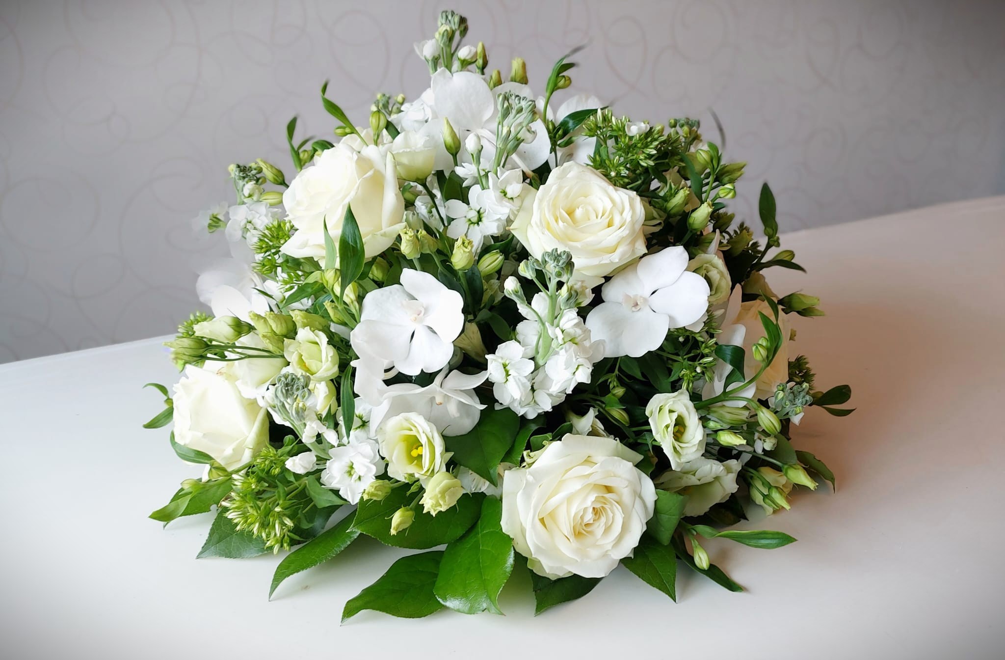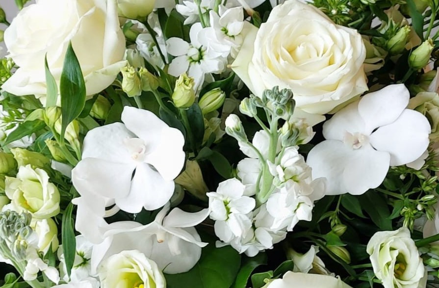 Een biedermeier gestoken met o.a. rozen, phlox en vanda.