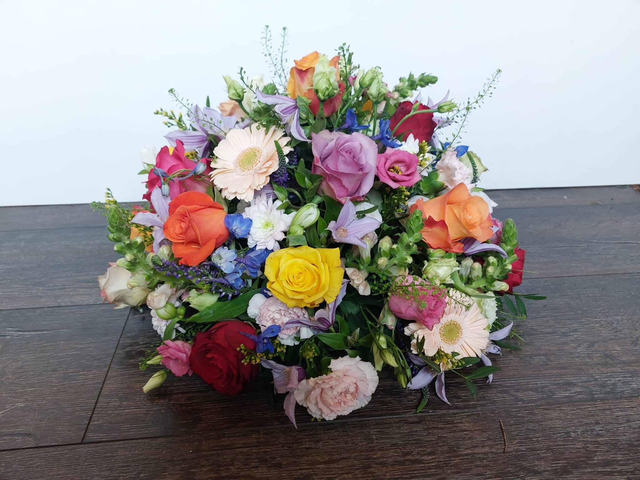 Door de beschikbaarheid van de bloemen kan het bonte rouwstuk afwijken van de foto.