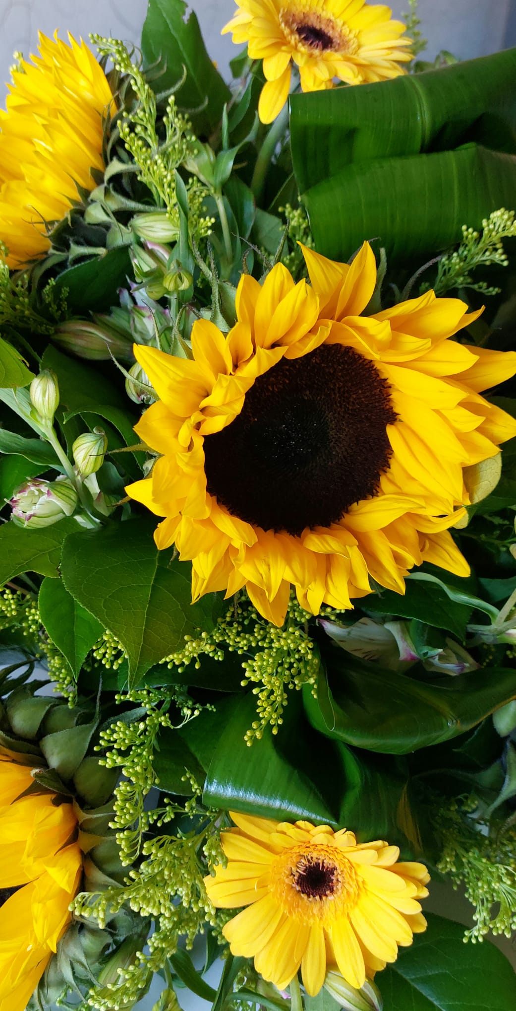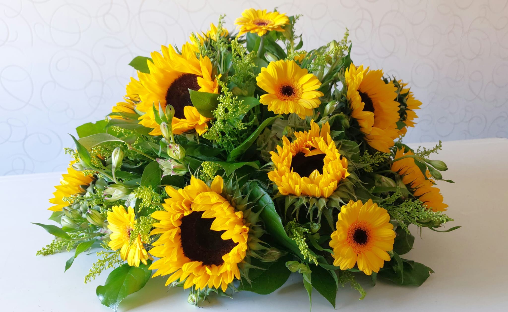 Een biedermeier opgestoken op oasis, met voornamelijk gele bloemen zoals zonnebloemen, gerbera’s en solidago.