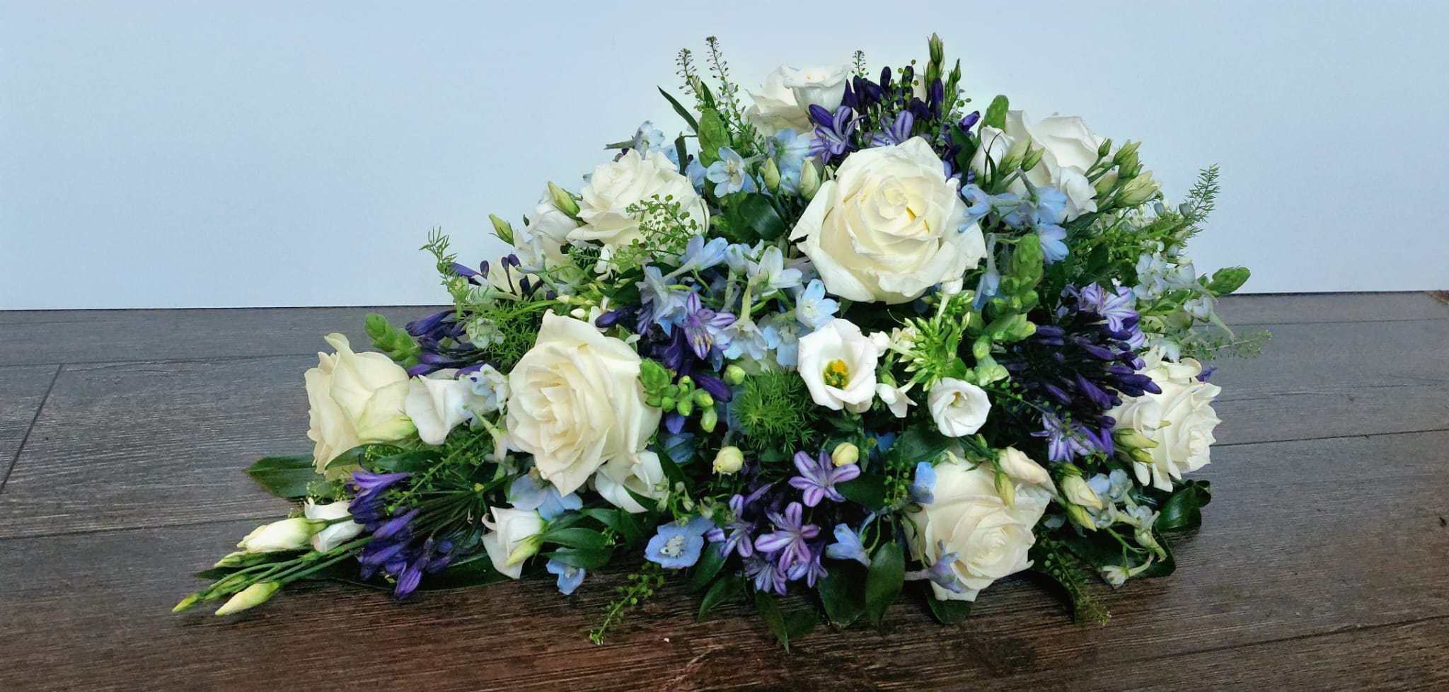 Deze schitterende rouwdruppel bestaat uit een combinatie van witte rozen, blauwe en paarse bloemen, en diverse bladgroen. De witte rozen vormen het middelpunt van het stuk, terwijl de blauwe en paarse bloemen, zoals agapanthus en delphinium, een mooie kleurtoevoeging geven.