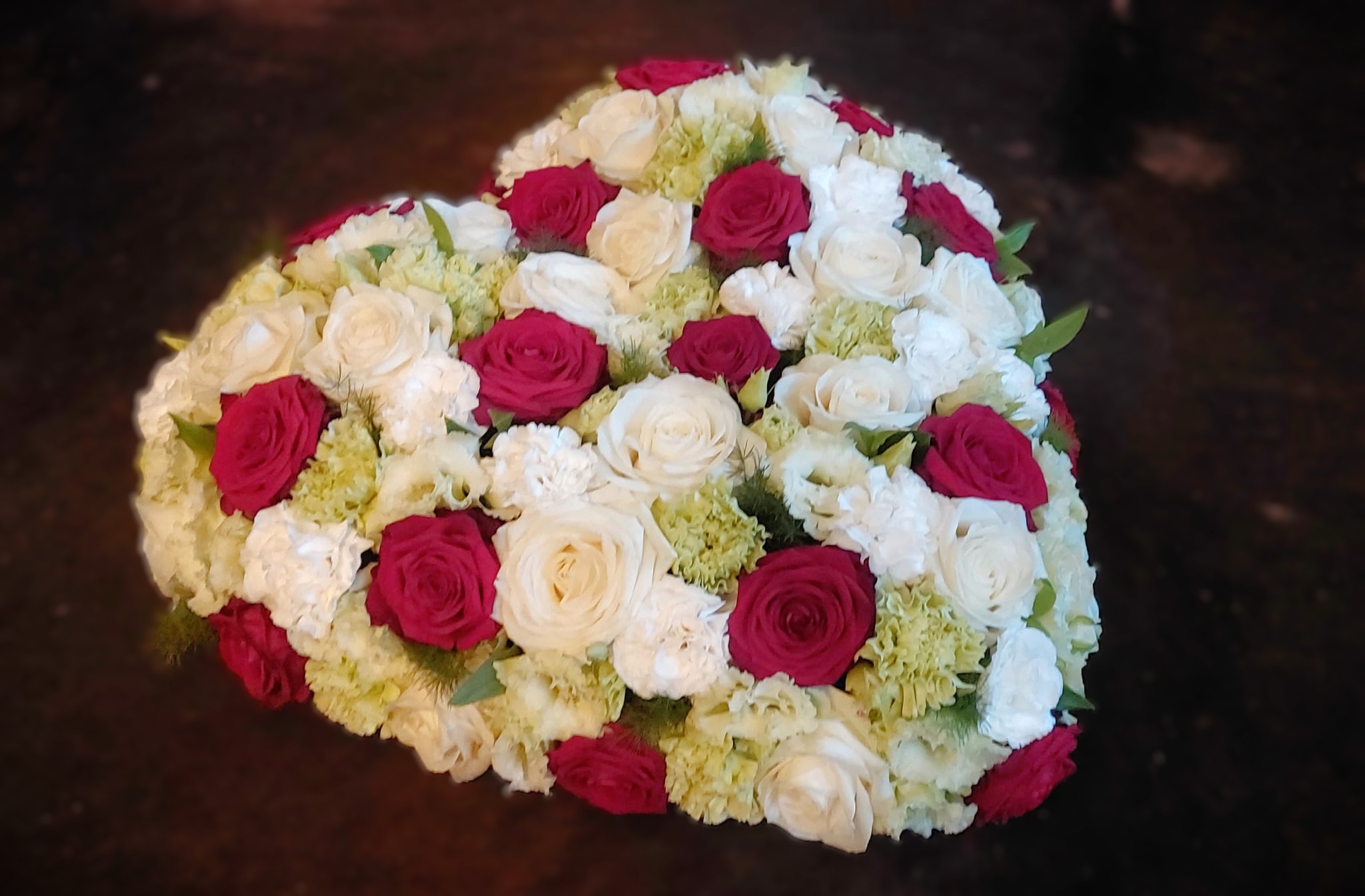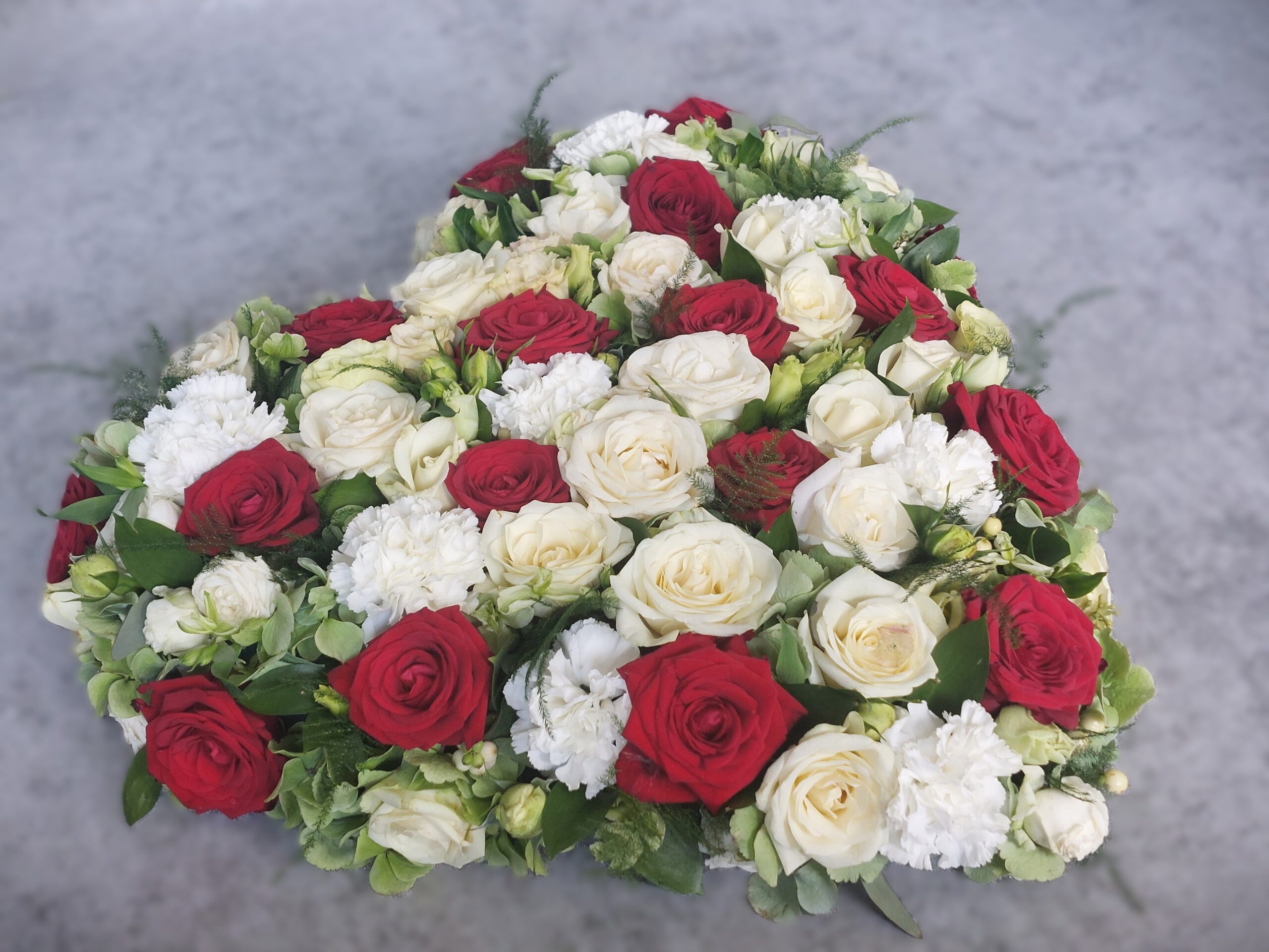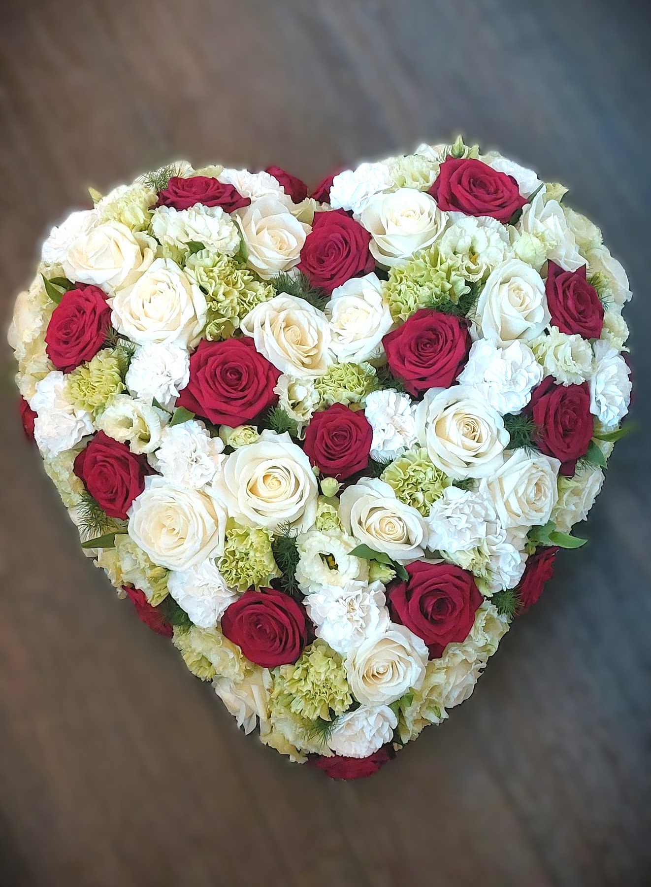 Rouwhart Herinnering vertegenwoordigt de liefde en het respect die rode rozen symboliseren, de puurheid en onschuld van witte anjers, en de elegantie van crèmekleurige rozen. Dit hart heeft een afmeting van 50 cm.