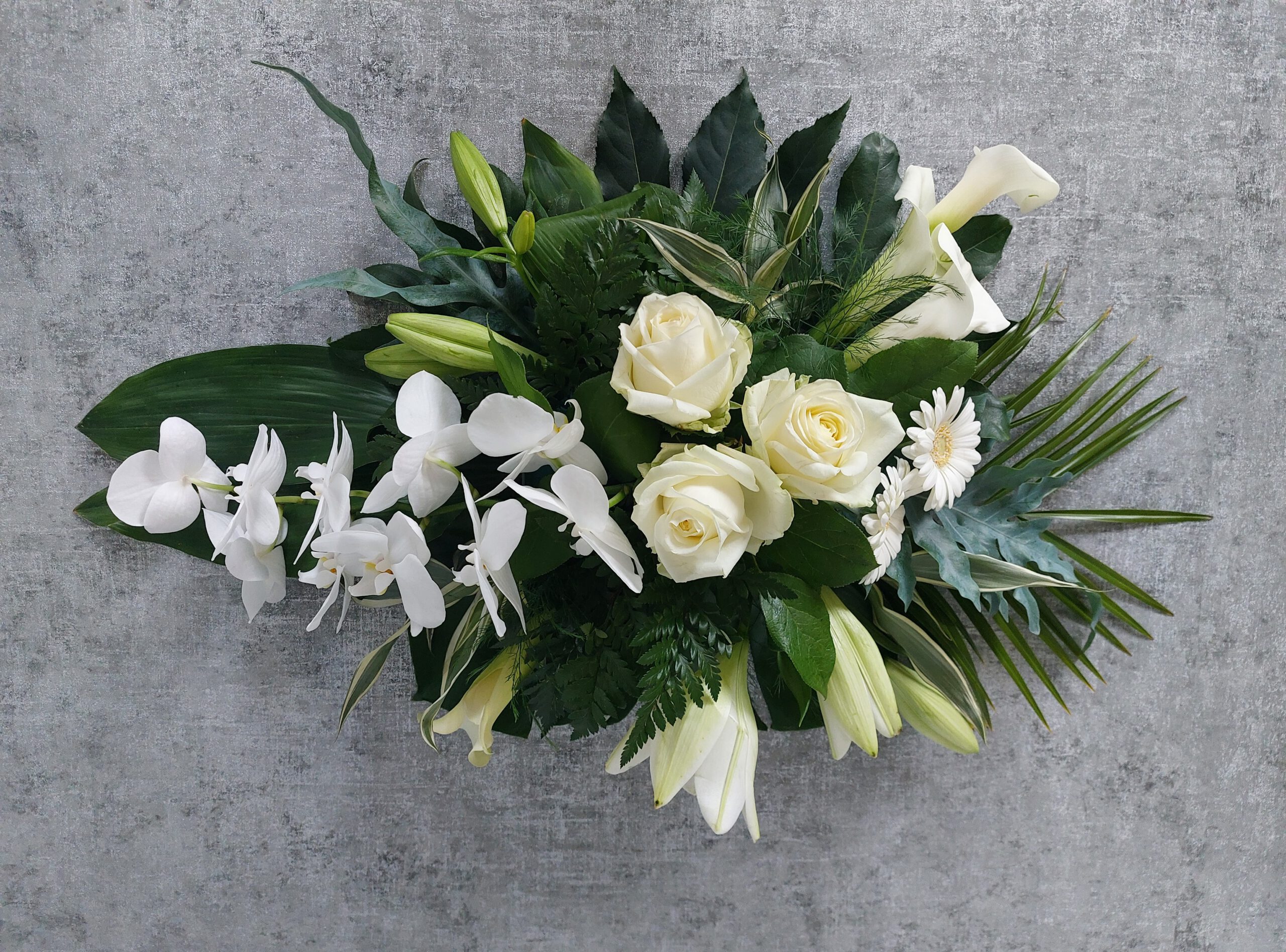 Dit rouwstuk is een elegante bloemschikking die voornamelijk bestaat uit witte bloemen zoals rozen, lelies en orchideeën, aangevuld met luxe bladgroen.