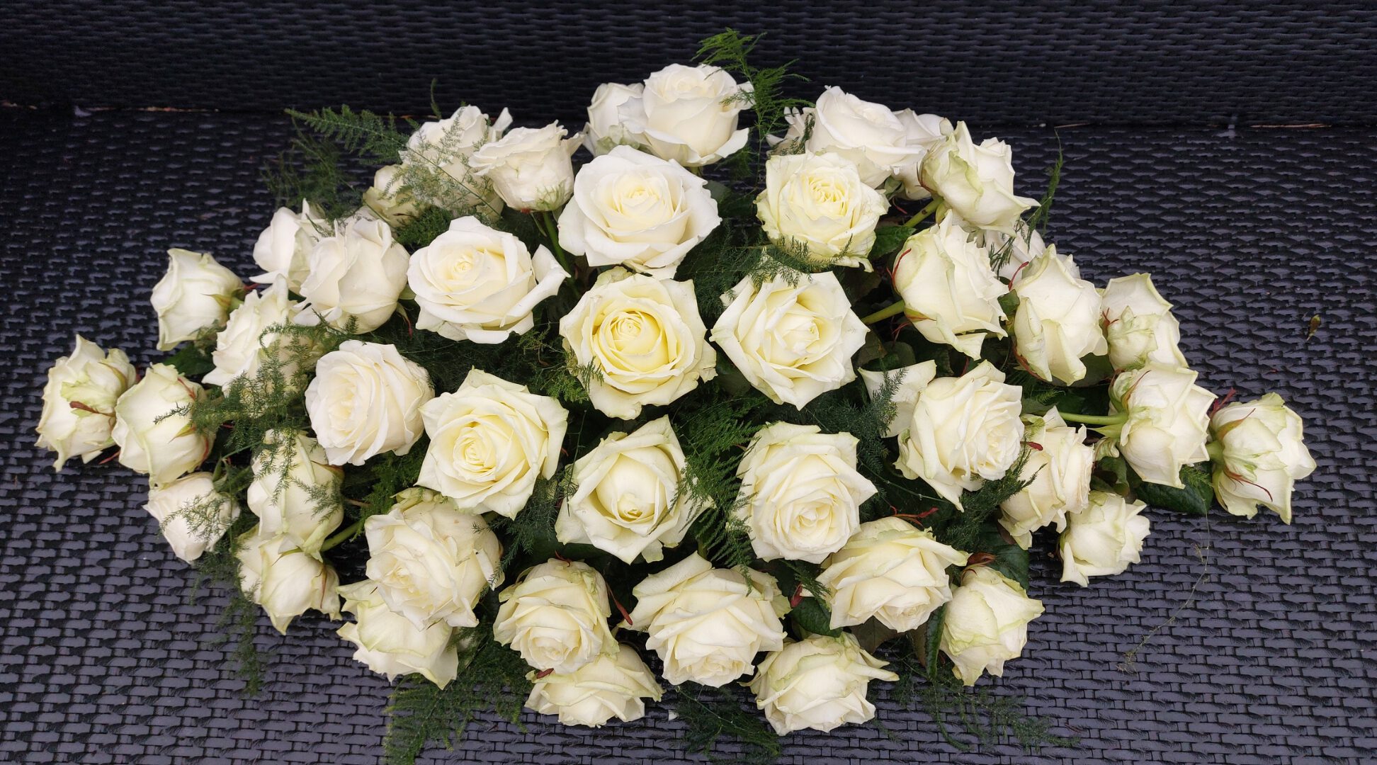 Dit rouwstuk is beschikbaar in diverse kleuren en verkrijgbaar met 40, 60, 80 of 100 rozen.